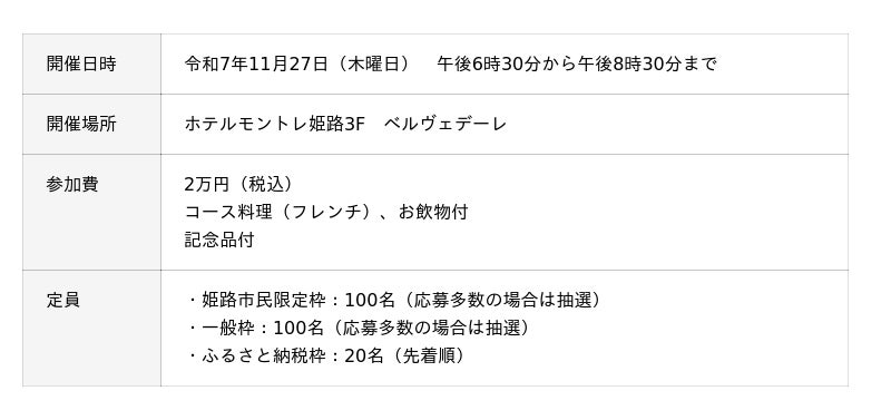 本市で開催予定の第38期竜王戦七番勝負第5局姫路対局に向け、ホテルにてコース料理を食べながら、藤井聡太竜王と挑戦者の佐々木勇気八段の決意表明や、棋士による見どころ解説などを行います。
