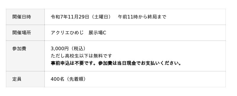 当選者は会場の受付で当選通知(メール)の提示と、参加費2万円を現金でお支払いください。