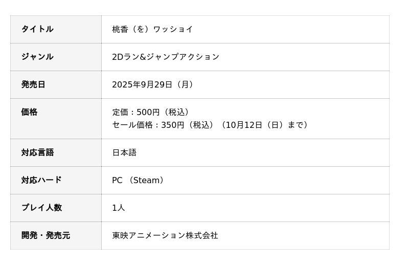 東映アニメーション株式会社(本社:東京都中野区、代表取締役社長:高木勝裕)は、アニメ「ガールズバンドクライ」から生まれた謎ゲーム『桃香(を)ワッショイ』をSteamプラットフォームにて2025年9月29日(月)に発売の決定と、2025年9月25日(木)~28日(日)に、幕張メッセで開催される「東京ゲームショウ2025」への出展と試遊台を設置することをお知らせいたします。