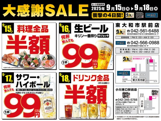 長年のご愛顧に感謝し、東京都東大和市の「魚民 東大和市駅前店」「横濱魚萬 東大和市駅前店」、東京都小平市の「目利きの銀次 小川東口駅前店」の3店舗で、4日間の"日替わり割引セール"を開催します!