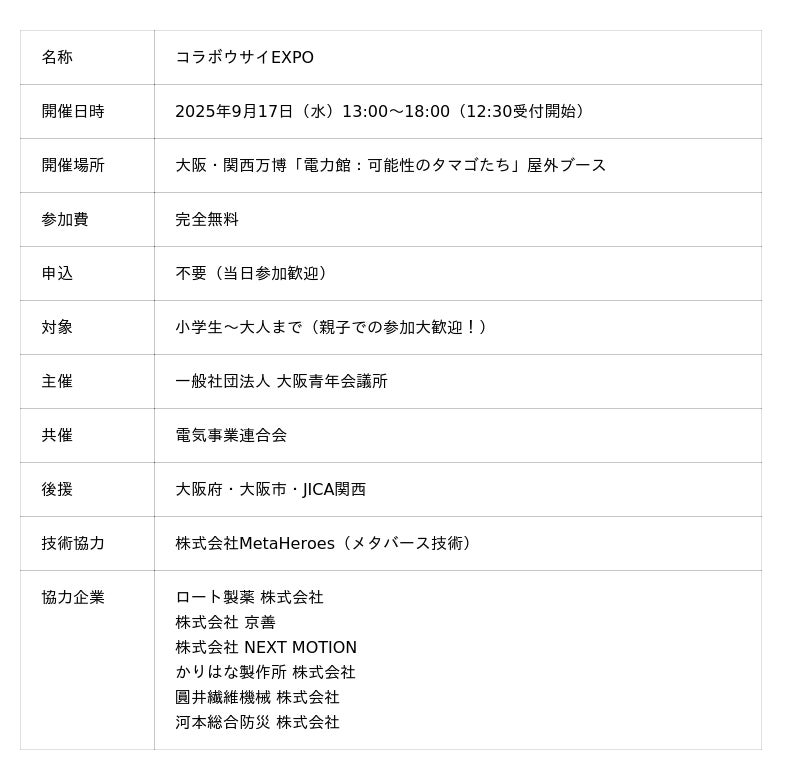 一般社団法人 大阪青年会議所(大阪市)は、2025年9月17日(水)、大阪・関西万博「電力館:可能性のタマゴたち」において、防災ビジネスコンテストと体験型ワークショップを融合させた『コラボウサイEXPO』を開催します。