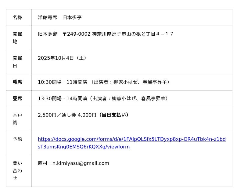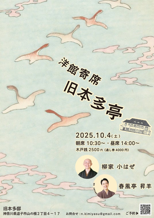 神奈川県逗子市に残る歴史的建築「旧本多邸」にて、2025年10月4日(土)、落語を気軽に楽しめる「洋館寄席 旧本多亭」を開催いたします。