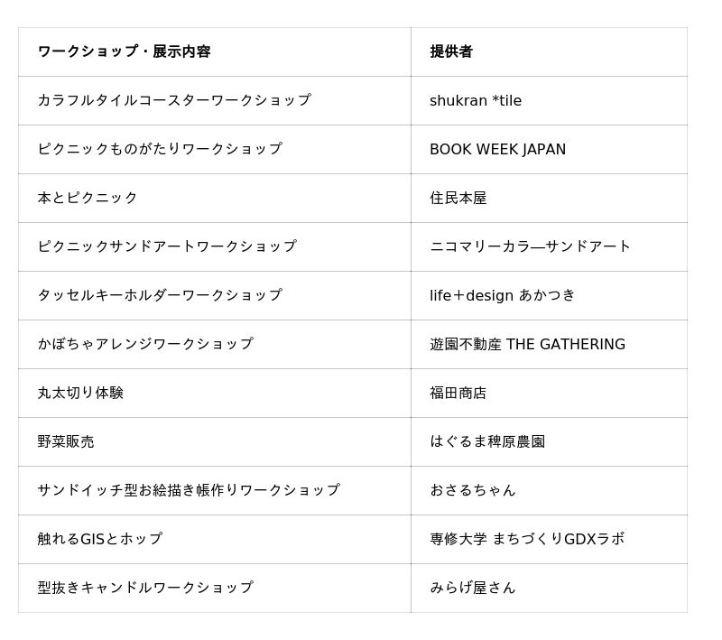 ワークショップなどの体験ブース本イベントのコンテンツの1つとして、タイルを使った小物を作るワークショップや、丸太切りを体験できるワークショップなど、主に地域を中心に活動をされているアーティストや事業者による体験型のワークショップや展示等を行います。11件のブースが設置され、子どもから大人まで体験できるプログラムも用意されています。