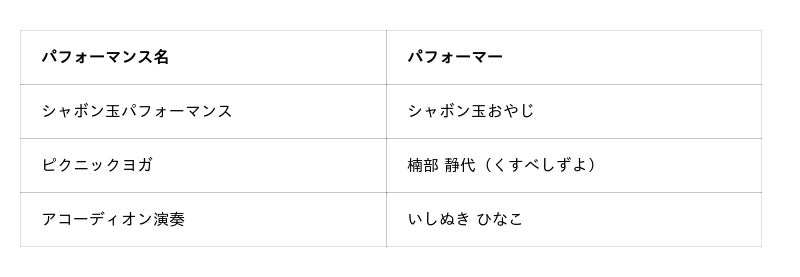 生田緑地でもおなじみのシャボン玉パフォーマンスや、ピクニックを楽しみながらできるヨガ、ピクニックの楽しさをさらに盛り上げるアコーディオンの演奏が予定されています。