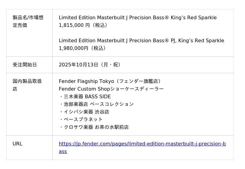 本モデルは、Fender Custom Shopマスタービルダーのグレッグ・フェスラーが手掛けた完全数量限定のリミテッドモデルで、2025年10月13日(月・祝)よりFender Flagship TokyoおよびFender Custom Shopショーケースディーラーにて受注を開始します。(納期は2026年10月頃を予定。)また、受注開始日となる10月13日(月・祝)には、フェンダー主催の体験型イベント【FENDER EXPERIENCE 2025】のステージにJが登場し、本モデルについて自ら語る特別な機会も予定されています。