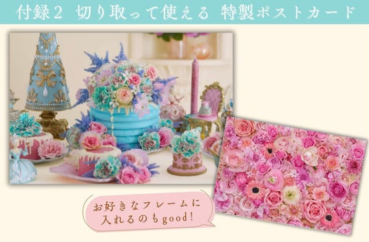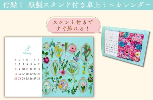 付録は、卓上ミニカレンダー(紙製のスタンド付き)&切り取って使えるポストカード(2枚)です。デスク上にミニカレンダーを置いたり、ポストカードはお好きなフレームに入れてお部屋に飾るのもおすすめ。いろいろな場所でラッキーフラワーを目にすることで、一層良い気を得られます。