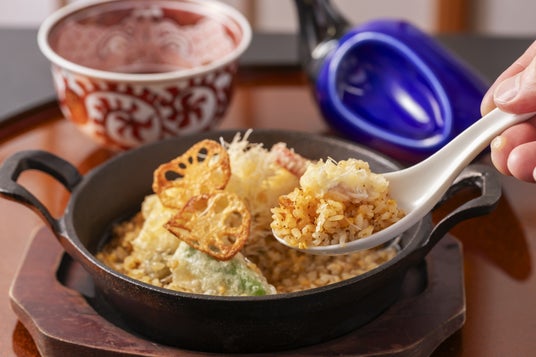 釡めし専門店が提供する炊きたて釡めしスタイルの加賀ふぐ天めし。ふぐと季節の野菜の天ぷらに、創業以来50年以上続く秘伝の釜ダシと玉子を合わせたふわトロ餡掛けをかけて頂きます。カラフルなあられを混ぜればさらに香ばしさがアップ!