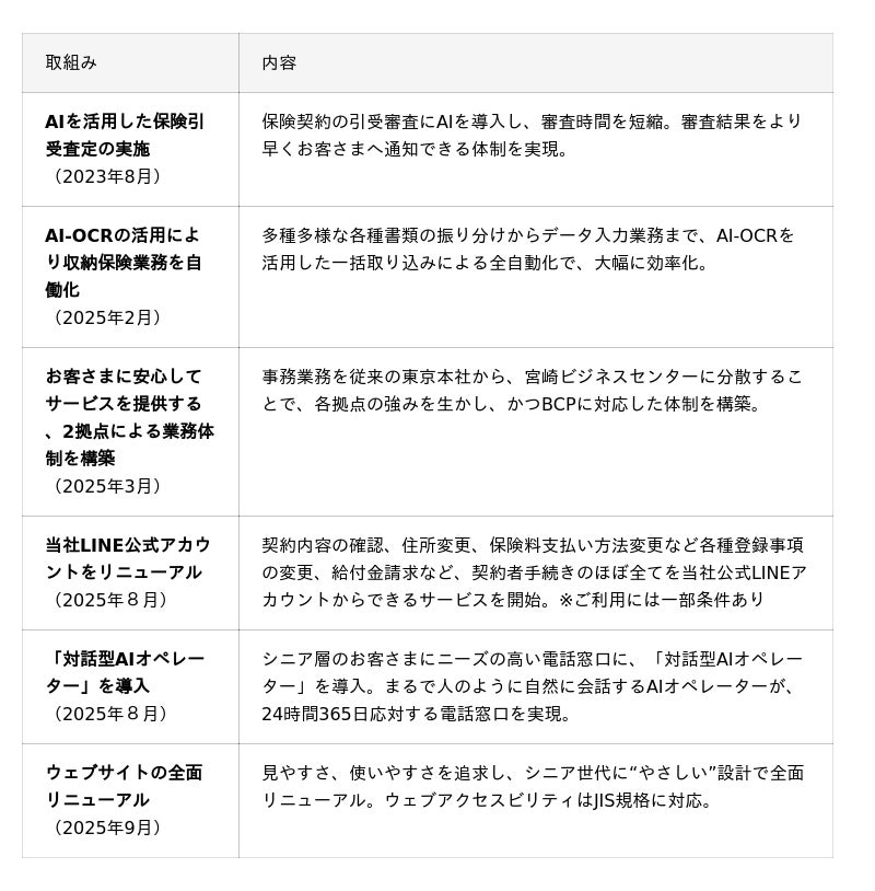 また、SBIグループの「顧客中心主義」に基づき、当社では「シニア世代応援プロジェクト」をはじめ、様々な取組みをおこなってまいりました。徹底的なデジタル化を推進し、ペーパーレス化などにより業務効率化を図るほか、お客さまに安心かつ利便性高く、当保険をご利用いただけるようになっております。