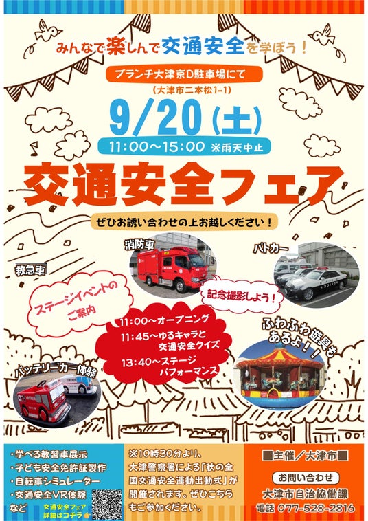 9月20日(土)11時から、ブランチ大津京D駐車場で交通安全を楽しく学ぶ大津市主催のイベント「交通安全フェア」を開催します。