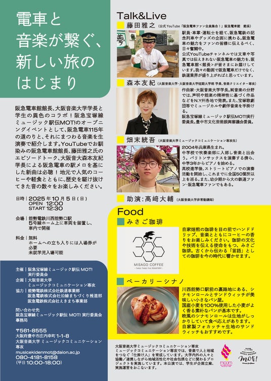 阪急電車館館長、大阪音楽大学学長と学生の異色のコラボ!阪急宝塚線ミュージック駅伝MOT!のオープニングイベントとして、阪急電車115年の道のりと、それにまつわる音楽を生演奏で紹介します。YouTubeでお馴染みの阪急電車館館長、藤田雅之氏のエピソードトーク、大阪音大森本友紀学長による阪急電車の駅メロを基にした新曲は必聴!地元で人気のコーヒーや軽食とともに、歴史を駆け抜けてきた音の数々をお楽しみください。