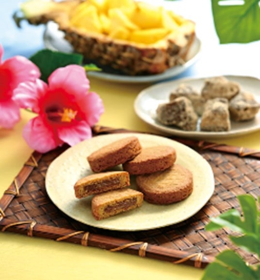 濃厚なパインジャムを、バターと沖縄県産の黒糖を練り込んだ生地で包み焼き上げました。生地はしっとりとした食感で、黒糖の深い味わいと、口いっぱいに広がるパイナップルの風味が特長の崎陽軒オリジナルパイナップルケーキです。