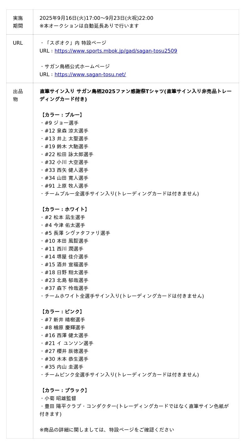 株式会社モバオク(本社:東京都渋谷区、代表取締役社長:小一原 宏樹、以下モバオク)がエンゲート株式会社(本社:東京都中央区、代表取締役:城戸 幸一郎、以下エンゲート)と業務提携し提供するスポーツチーム公式オークションサービス「スポオク」にて、J.LEAGUE所属のサガン鳥栖は2025年9月16日(火)より『サガン鳥栖2025ファン感謝祭 選手直筆サイン入りTシャツオークション』を開始します。