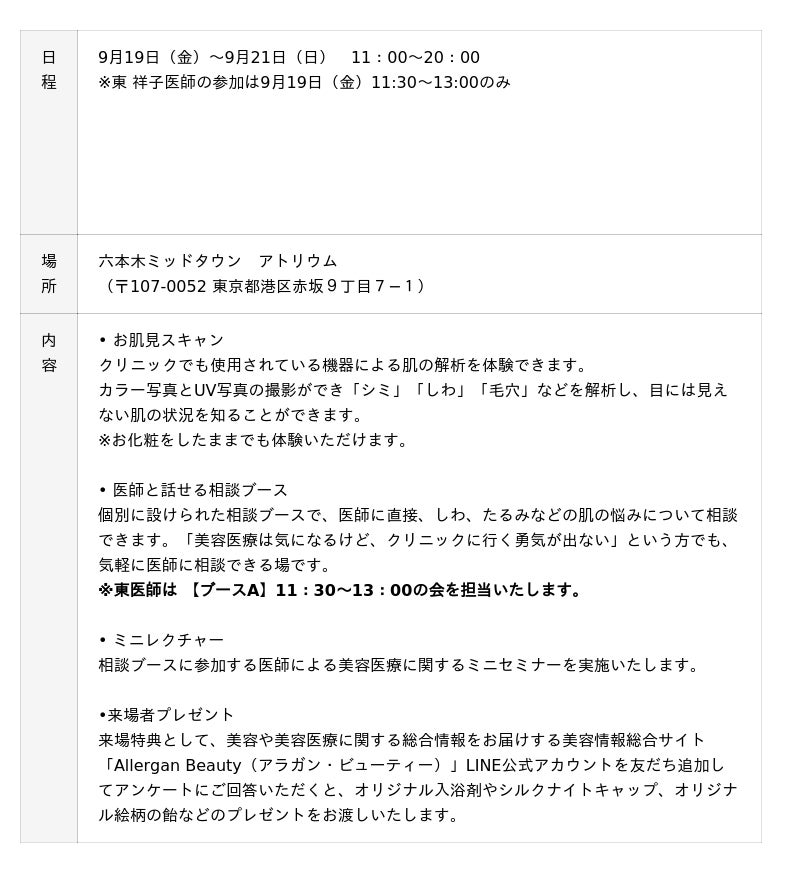 六本木ミッドタウン アトリウムで開催されるAllergan Aesthetics主催のポップアップイベントに麻布ビューティクリニック(所在地:東京都港区六本木7丁目8-6)より、東 祥子医師が参加いたします。