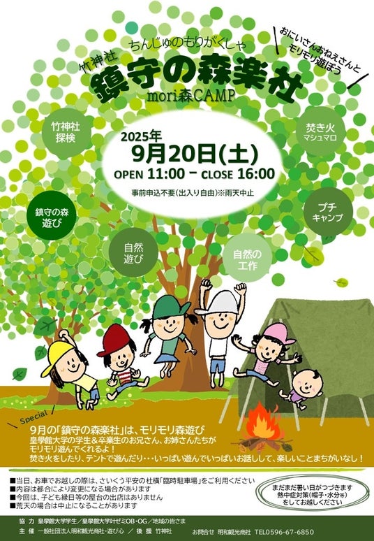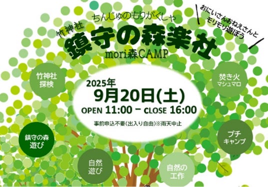 明和町の観光地域づくりを推進する一般社団法人明和観光商社(本社:三重県多気郡明和町、以下明和観光商社)は、地域住民とともに活性化に取り組む竹神社にて、9月20日(土)、子どもたちのための自然体験イベント「鎮守の森楽社 - mori森CAMP」を実施します。当日は、竹神社の鎮守の森を開放し、皇學館大学の学生・卒業生たちとともに、自然の中で遊び・学び・交流できる場を設けます。今後も地域コミュニティ主体で、自然や文化資源を活かした観光まちづくりを進めてまいります。