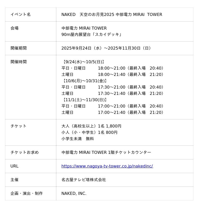 株式会社ネイキッド(英語表記:NAKED, INC.、 所在地:東京都渋谷区、代表:村松亮太郎)は、名古屋テレビ塔株式会社(所在地:愛知県名古屋市)が運営する「中部電力 MIRAI TOWER」の90m屋内展望台「スカイデッキ」にて、2025年9月24日(水)より11月30日(日)まで、秋限定イベント『NAKED 天空のお月見 2025 中部電力 MIRAI TOWER』の企画・演出・制作を手掛けます。