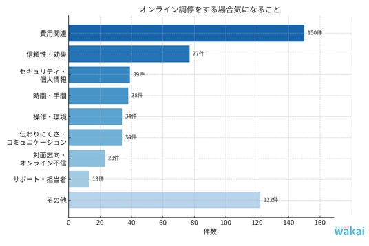 今回の調査で、調停の利用に対して前向きであり、もっと身近になればいいと考える人が多数いることで、オンライン調停のさらなる周知がなされれば、需要は高まることが予想されます。そこで、オンライン調停をする際に気になることを聞いたところ、「費用関連」150件が最も多く、次いで「信頼性・効果」77件、その後に「セキュリティ・個人情報」39件、「時間・手間」38件などの順となりました。「費用」「セキュリティ」「相手の態度」といった懸念が明らかになったことから、サービスとしては費用体系の明確化、強固なセキュリティ対策、そしてオンラインでも安心して利用できるサポート体制の構築が求められています。