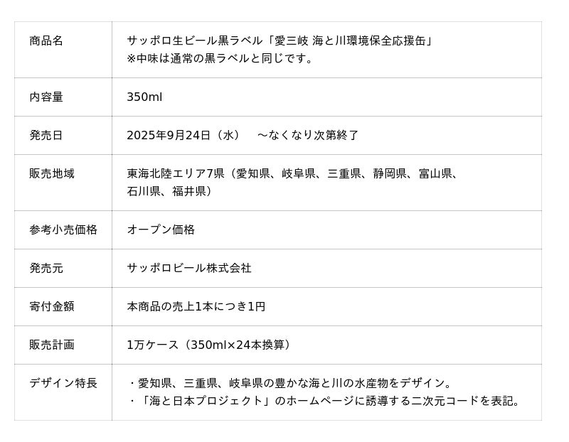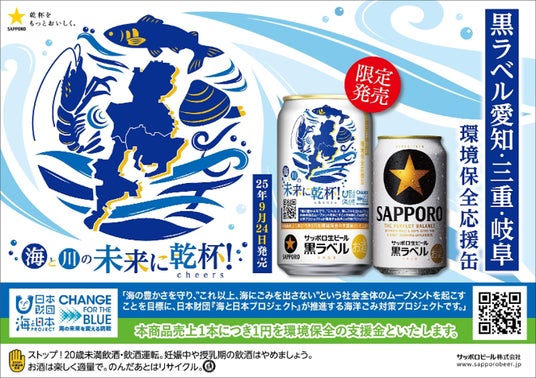 一般社団法人海と日本プロジェクトin愛知県は、海と日本プロジェクトの趣旨にご賛同いただいたサッポロビール株式会社とコラボレーションし、2025年9月24日(水)、同社よりサッポロ生ビール黒ラベル「愛三岐 海と川環境保全応援缶」を、東海北陸エリア7県で数量限定で発売します。
