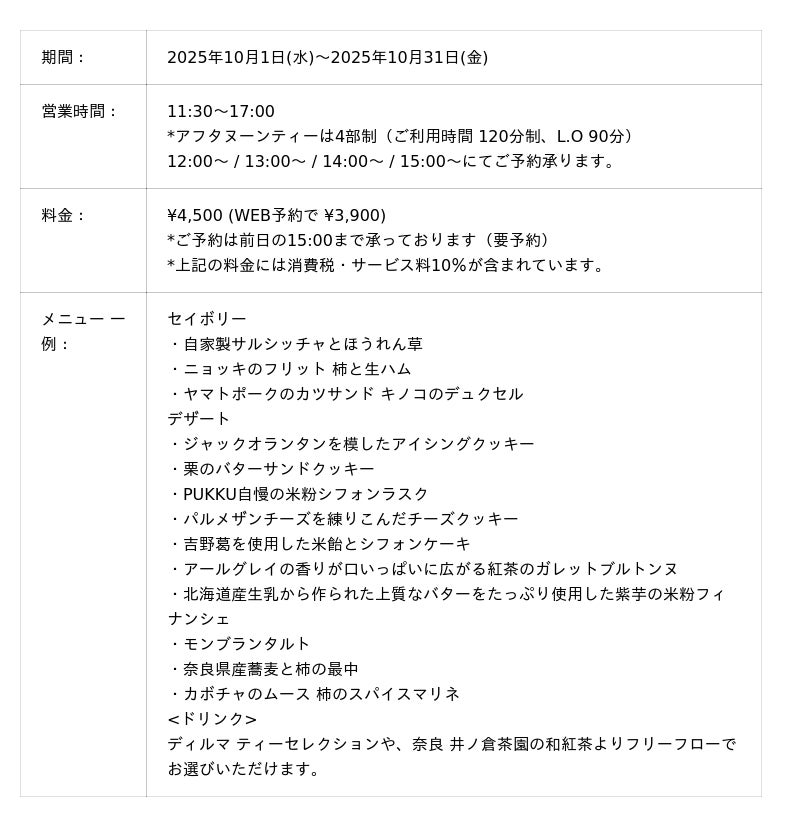 ハロウィンらしさを演出しながら、スイーツやセイボリーにちょっとした秋の魔法と季節感をプラス。PUKKU×ノボテル奈良のコラボで贈る今回のハロウィンアフタヌーンティーは、ハロウィンらしさを演出しつつ、秋の味覚を存分にお楽しみいただけるよう、素材と製法にこだわりました。セイボリーからデザートまで、秋の味覚を盛り込んだラインナップをご用意しました。