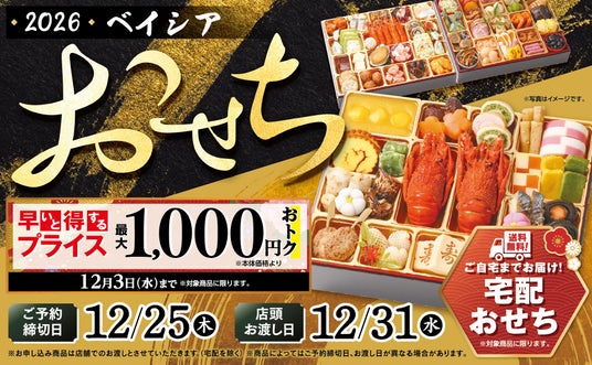 株式会社ベイシア(本社:群馬県前橋市、代表取締役社長:相木孝仁)は、9月17日(水)より2026年のおせちの予約受付を開始しました。ベイシアのオリジナルおせちは、こだわりの食材を彩り豊かに盛り込み、人数やお好みに合わせて選べる多彩なラインナップをご用意。和風・洋風のバリエーションを取り揃え、ご家族皆さまで楽しめる内容となっております。さらに、12月3日(水)までの早期のご予約で対象おせち12品が最大1,000円お得になる特典もございます。ぜひベイシアのおせちで贅を味わい、晴れやかな新年を迎えてみてはいかがでしょうか。