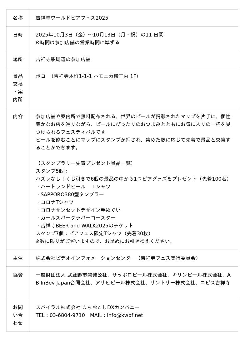 デジタルで未来最適をリードするスパイラル株式会社のまちおこしDXカンパニー(東京都港区、代表取締役グループCEO 佐谷 宣昭)は、株式会社ビデオインフォメーションセンター(東京都武蔵野市、代表取締役 手塚 一郎)とともに、2025年10月3日(金)から10月13日(月・祝)までの11日間、吉祥寺にて世界のビールが堪能できる「吉祥寺ワールドビアフェス2025」を開催しますので、お知らせいたします。