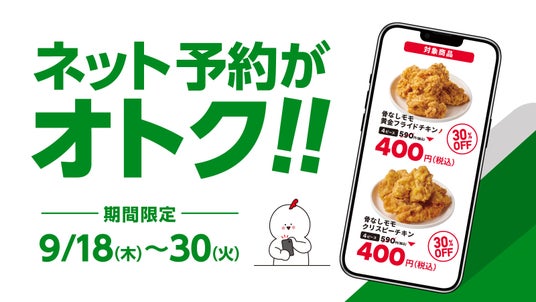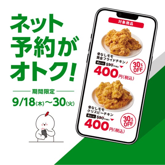 この期間ネット予約のお客様限定で、対象商品である骨なしモ黄金フライドチキン、骨なしモモクリスピーチキンの4ピース入りがそれぞれ590円⇒400円(税込)と、30%以上お安く買えるとってもトクなキャンペーンです。