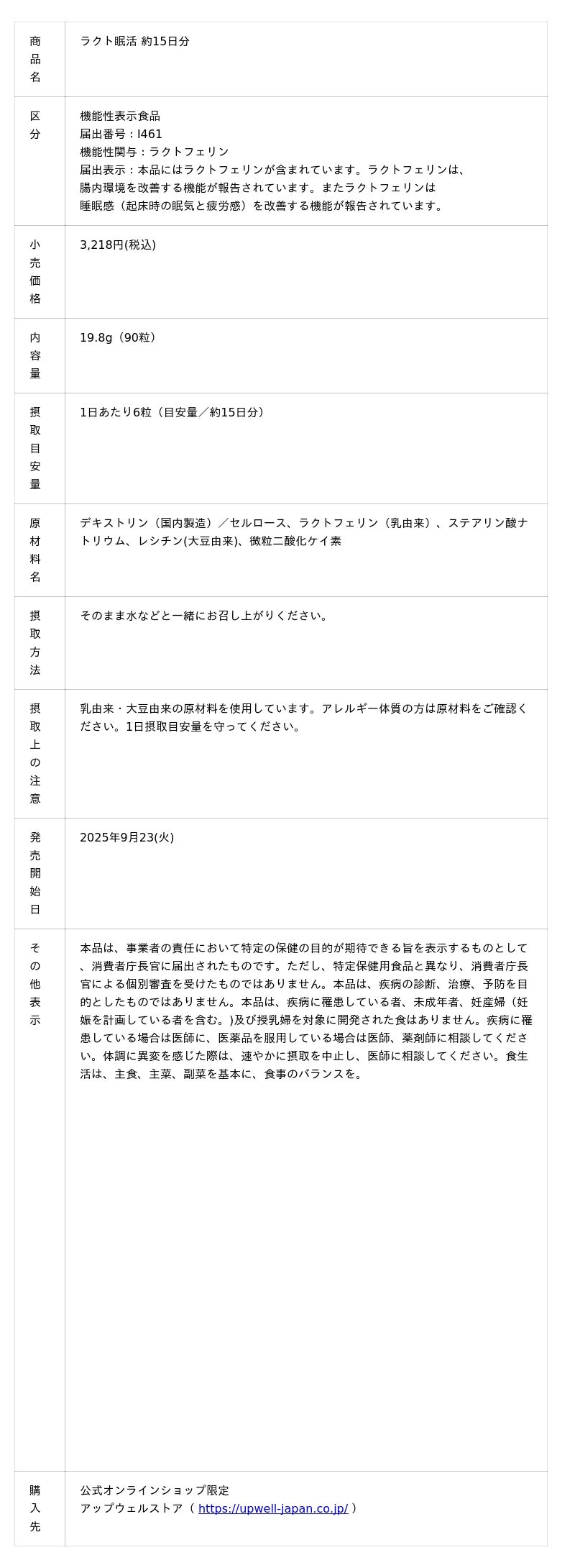 株式会社アップウェル(本社:福岡県福岡市、代表取締役社長:浜田光太郎) は、2025年9月23日(火)より、機能性表示食品「ラクト眠活 約15日分」をオンラインショップ「アップウェルストア」にてリニューアル販売を開始いたします。※浜は旧字体です。