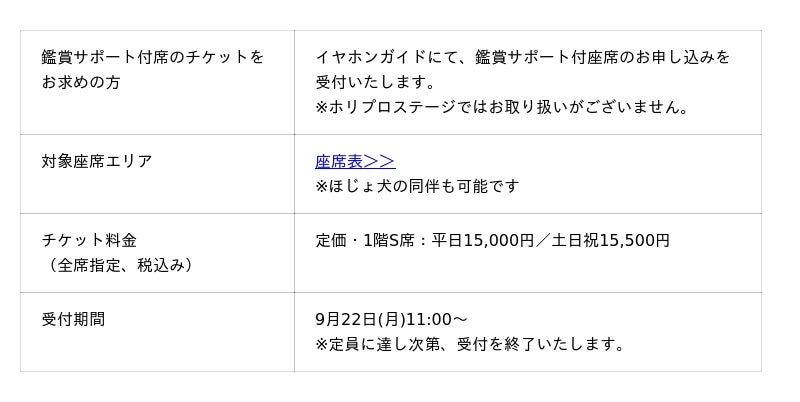 上記以外の回にご来場の、きこえない・きこえにくいお客様への台本貸し出しサポートを予定しております。お申し込み受付は、ホリプロステージにて、公演一週間前を目処にフォームによる受付を予定しております。