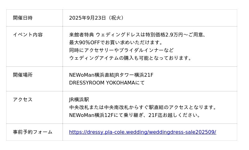 【開催告知】最大90%OFF!「秋のBIGセール ウェディングドレスセール in 横浜」9月23日(祝火)開催決定