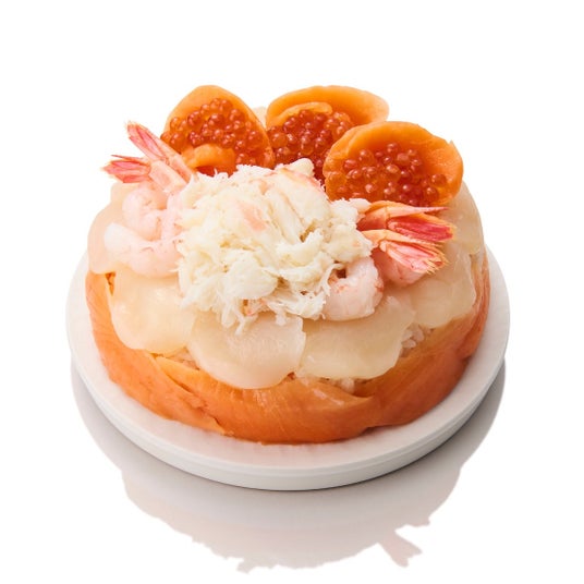 酢飯をスポンジに見立て、とびっことマグロのたたきを重ねた海鮮ケーキ。紅白を基調に、サーモンや帆立など様々な海の幸をトッピングしました。食感のアクセントも楽しく、まるで海の宝石箱のような、見た目も華やかな一品です。