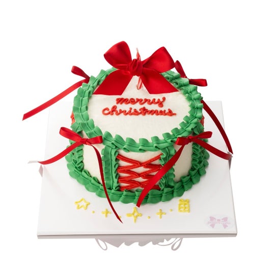 甘酸っぱいストロベリーソースと生クリームをスポンジでサンドし、仕上げに赤いリボンで華やかにレースアップしたクリスマスケーキ。リボンやフリル、キラキラ輝くお星さまの装飾は、まるでおとぎの国への招待状のよう。聖なる夜をとびきりファンシーに彩ります。