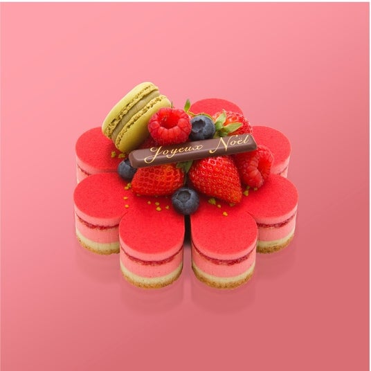 ホワイトチョコレート仕立てのいちごクリームと、コクのあるピスタチオクリームの2層に、サクッと軽やかな食感のヘーゼルナッツサブレを重ねたケーキ。花をかたどったデザインと鮮やかなピンク色が目を引きます。洋酒不使用のため、お子さまとも一緒にお召し上がりいただけます。