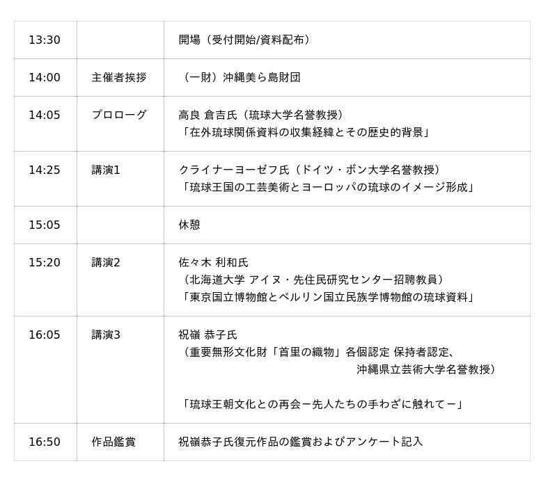 【後援】沖縄県教育委員会、沖縄県立博物館・美術館、沖縄県博物館協会、那覇市教育委員会、NHK沖縄放送局、沖縄テレビ放送株式会社、株式会社エフエム沖縄、株式会社沖縄タイムス社、株式会社ラジオ沖縄、株式会社琉球新報社、琉球放送株式会社、琉球朝日放送株式会社
