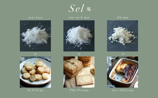 甘さを引き立て、深いコクとキラッとした華やかさをもたらしてくれます。この本では粒の大きさや塩味の強さの違う3種類の塩を例に紹介します。
