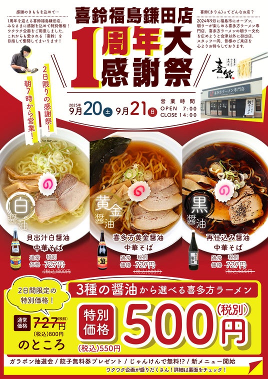 【オープン1周年記念イベント】9/20(土)・21(日)「喜多方ラーメン専門店喜鈴福島鎌田店」にて【1周年大感謝祭】を開催!