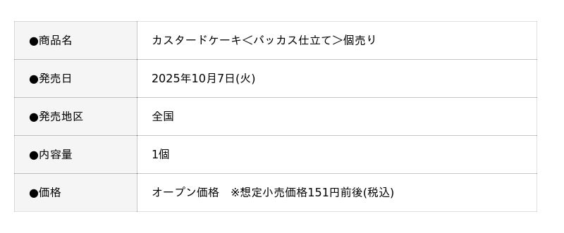 ・カスタードケーキでバッカスの味わいを表現した、洋酒香る大人のためのカスタードケーキです。洋酒使用量が20%アップ(※2)して、コニャック(※3)の熟成した芳醇な香りと洋酒感を堪能できます。