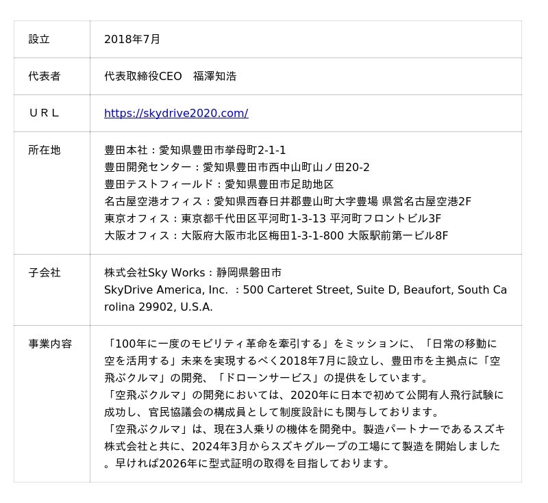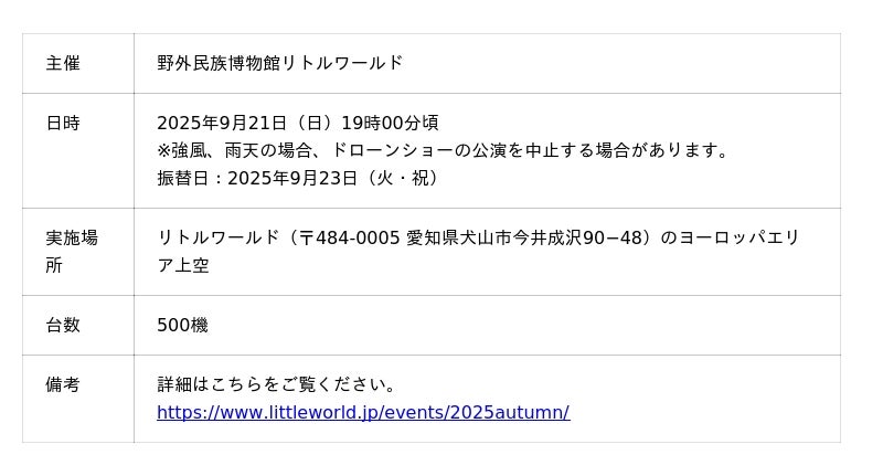 「空飛ぶクルマ」(※1)の開発およびドローン関連サービスを提供する株式会社SkyDrive(本社:愛知県豊田市、代表取締役CEO 福澤知浩、以下「SkyDrive」)は、2025年9月21日(日)に野外民族博物館リトルワールド(愛知県犬山市、以下「リトルワールド」)で開催される「ドローンショー~バーバパパとフランスの旅~」において、ドローンショーを実施することをお知らせいたします。