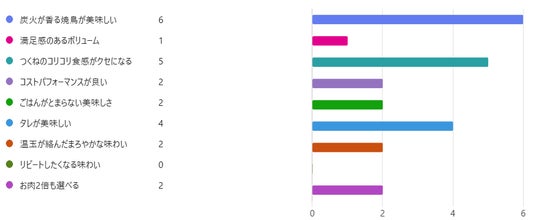最も多くの票を集めたのは『炭火が香る焼鳥が美味しい』というポイントでした。以下2位は『つくねのコリコリ食感がクセになる』、『タレが美味しい』でした。