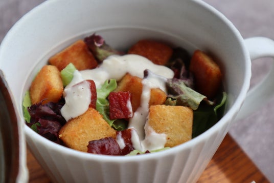 『uni(ユニ)』で今回提供されるランチ「heeee!ランチプレート」より、紀ノ国屋*の名物かつサンドのパンの耳を使ったシーザーサラダ(掲載の画像はイメージです。実際の内容とは異なる場合があります)* 株式会社紀ノ國屋 https://www.e-kinokuniya.com/