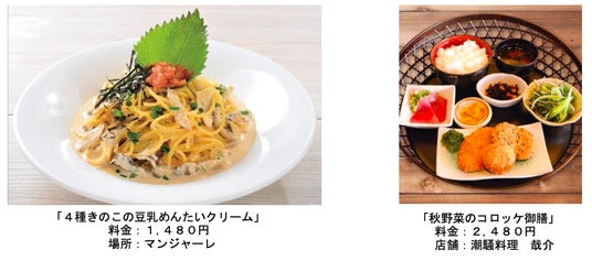 島内のレストランや軽飲食店舗では、食欲の秋にぴったりなメニューをご用意いたします。秋の味覚のひとつであるきのこをたっぷりと使用した「4種きのこの豆乳めんたいクリーム」や、さつまいもの甘さを味わえる「紫芋とさつまいものタルト(ドリンク付)」など、メインのお食事からスイーツまで取り揃えております。