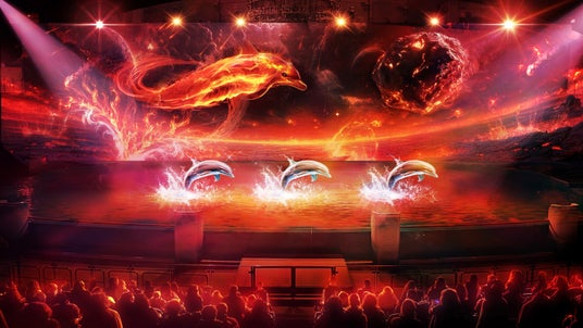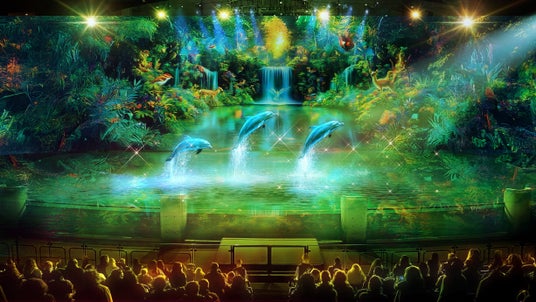 約1,500名を収容可能な「ライブスタジアム」で、イルカと映像・光・音・噴水の演出との一体感によって生み出される没入型ナイトパフォーマンスをお楽しみください。