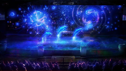 トレーナーの動きやイルカの演目に完全に同期した映像・視覚演出を可能にするシステムによって、通常ではシンクロし得ない奇跡の瞬間を連続的に生み出し、イルカたちがもつ本来の躍動を最大化させたパフォーマンスとなります。