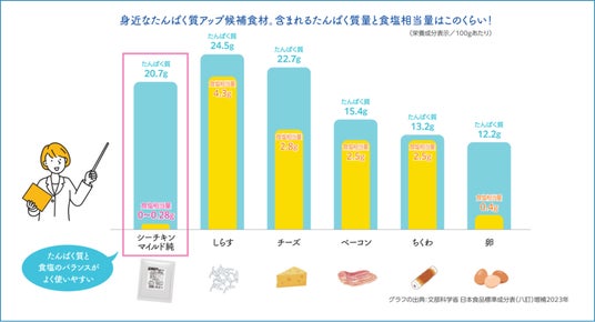 (画像:企業展示ブースで紹介した「身近なたんぱく質アップ候補食材比較グラフ」)