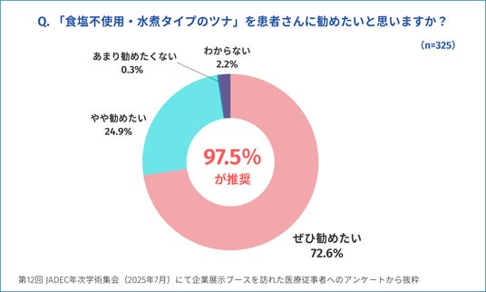 続く7月の学会での調査では、「このツナを患者さんに勧めたい」と回答した医療従事者が97.5%と多数を占めました。(「ぜひ勧めたい」72.6%、「やや勧めたい」24.9%)
