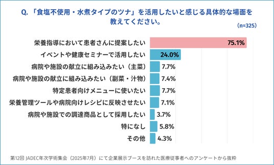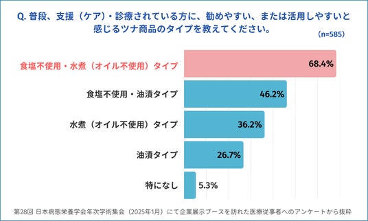 そこでまず、2025年1月に「ツナの使い分けに関するアンケート調査」を実施すると、「油漬」「水煮」「食塩不使用」など複数タイプのツナのうち、家庭ではまだ定番とはいえない「食塩不使用・水煮(オイル不使用)タイプ」が医療のプロならではの視点で新たな価値が見出され、最も高い支持を集めました。この結果を踏まえ、7月の調査では「食塩不使用・水煮(オイル不使用)タイプ」に絞って追加調査を実施しました。