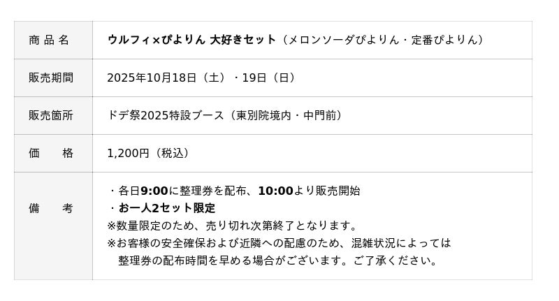 今回は、ウルフィの大好物"メロンソーダ"をイメージした限定ぴよりん「メロンソーダぴよりん」と、定番「ぴよりん」を一緒に楽しめる「ウルフィ×ぴよりん 大好きセット」を、2025年10月18日(土)・19日(日)の2日間、『ドデ祭2025』会場にて販売いたします。