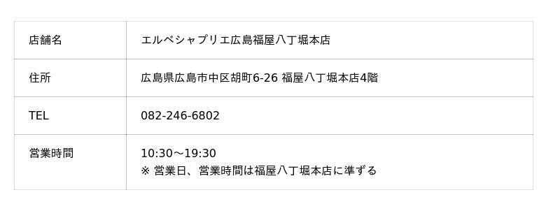 『エルベシャプリエ広島福屋八丁堀本店』は、9月4日にリニューアルオープンいたしました。広く新しくなった店内で、お好みのカラーをじっくりとお選びいただける「パーソナルオーダー会」を開催いたします。