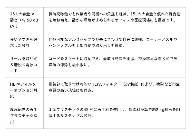 ケルヒャーの新製品「T 15/1」は、約50dB(A)の静音設計を採用することで、オフィスや商業施設、病院など静かな環境が求められる場所でも稼働できます。また、15Lの大容量容器と、着脱式かつリール巻取り式の電源コードを組み合わせることで、コード収納や交換にかかる時間を短縮し、現場のダウンタイムを大幅に削減します。