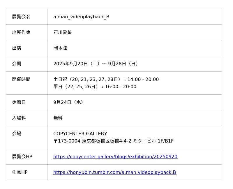 この度、アートギャラリー「COPYCENTER GALLERY」は、(東京・板橋、運営:株式会社PHOTOPRI)は、2025年9月20日(土)から9月28日(日)まで、石川愛梨による個展「a man_videoplayback_B」を開催します。本展は、会場そのものが映画の舞台となり、来場者が作品世界に参加することで一本の映画を完成させることを目指す、ユニークなインスタレーションです。