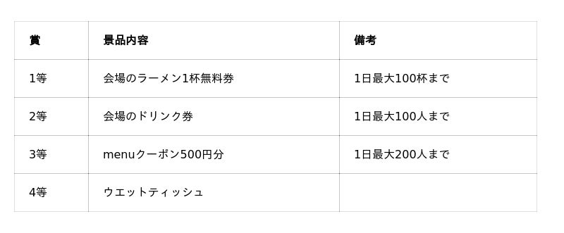 当日、menuブースでmenuアプリ画面をご提示いただいた方を対象にガラポン抽選会を実施。1等~4等までの景品が当たります。