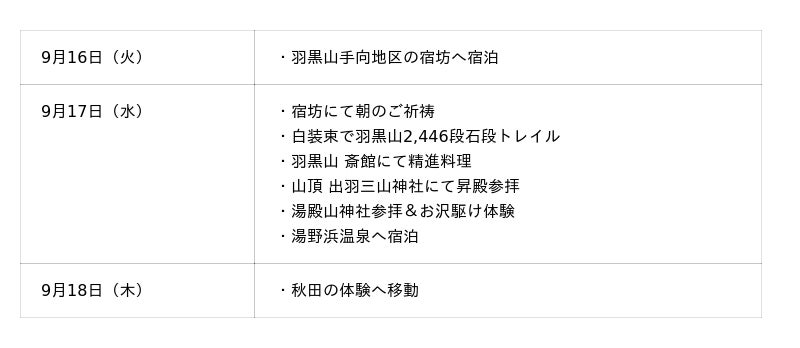 山形県鶴岡市では9月16日から9月18日にかけて、古より続く出羽三山の山岳信仰と豊かな自然に触れる特別な一日を体験いただきました。